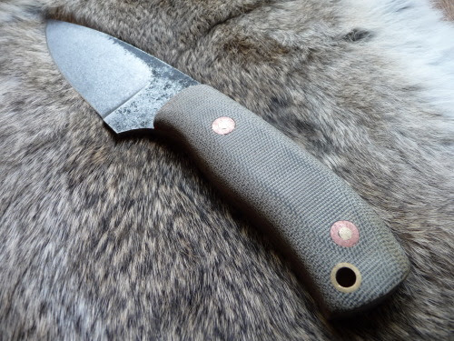 3.5mm high carbon etched and stonewashed saw blade steel , stonewashed micarta scales over G-10 liners with hammered copper / brass Loveless bolts and brass lanyard tube .